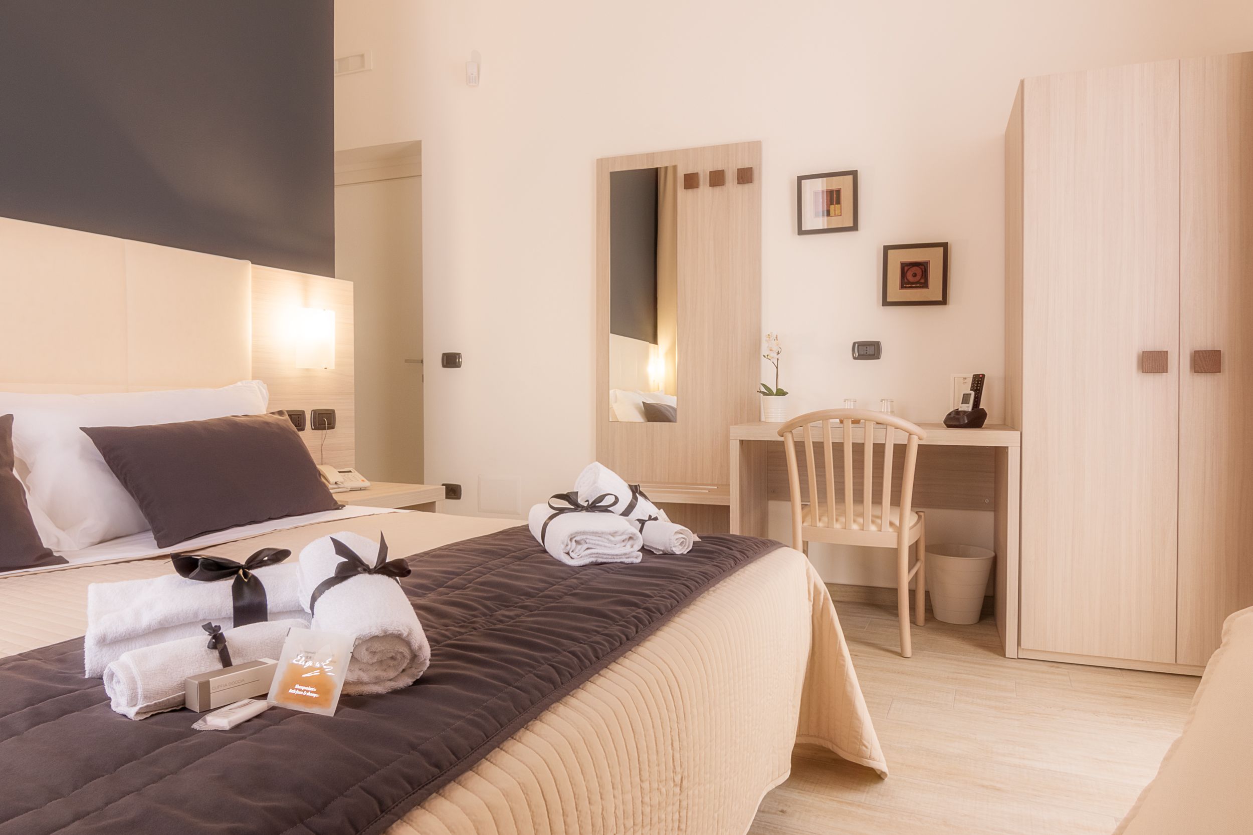 La camera può essere allestita con letto matrimoniale oppure con due letti singoli; è possibile aggiungere un terzo letto per ospitare comodamente un bambino; luminosa grazie ai due ampi balconi finestrati vista centro città; bagno in camera ed arredameno in stile moderno con tutti i confort di una camera d'albergo di alto livello.